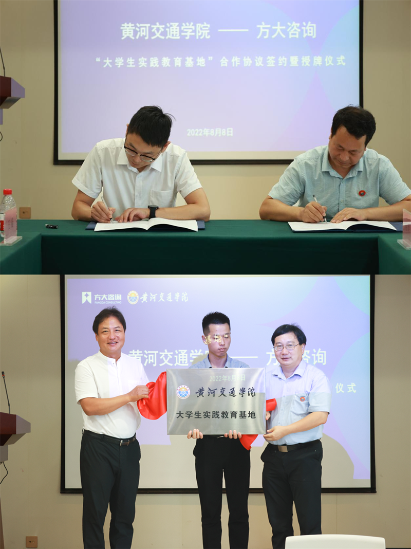 为加强校企合作,拓宽毕业生就业渠道,改革人才培养模式,8月8日上午,44118太阳成城集团常务副董事长胡世雄,交通工程公司党委书记王涛涛、常务副经理李水泉、造价教研室主任马健华、教师代表何玲一行五人赴方大国际工程咨询股份有限公司交流校企合作,并举办“老员工实践教育基地”揭牌仪式。